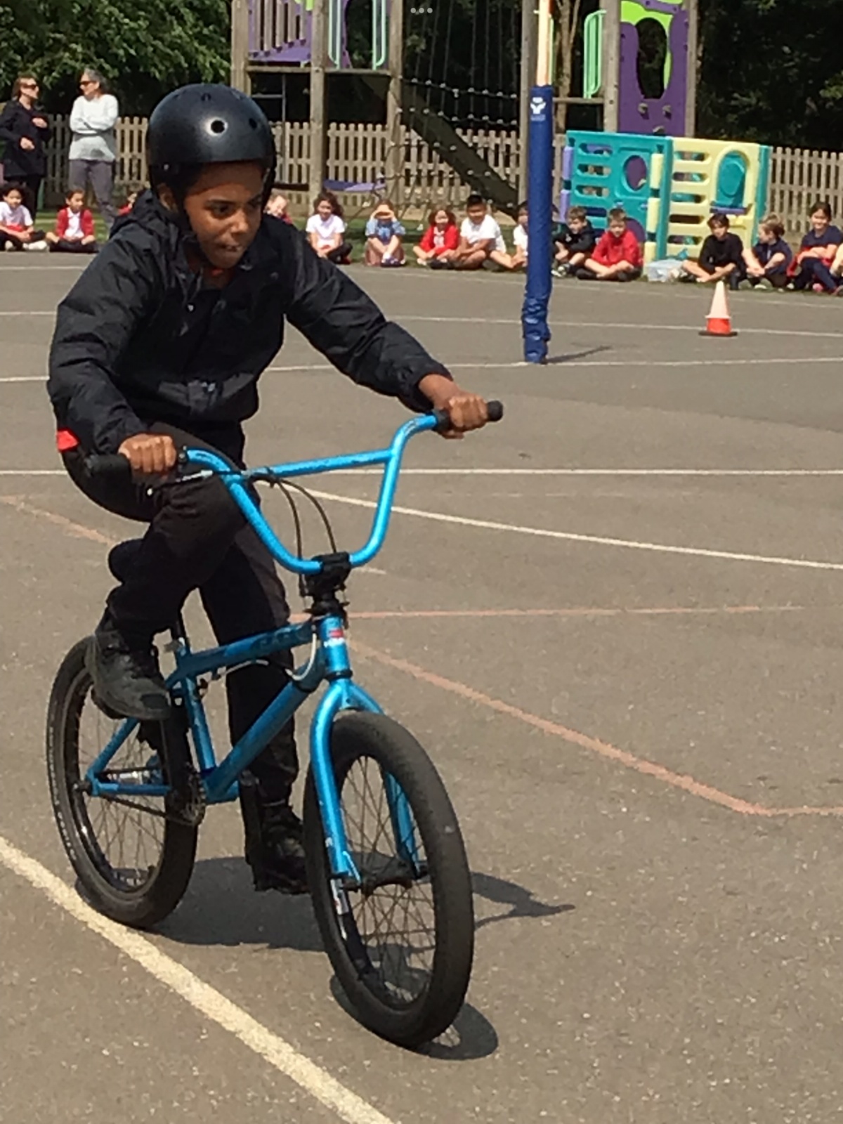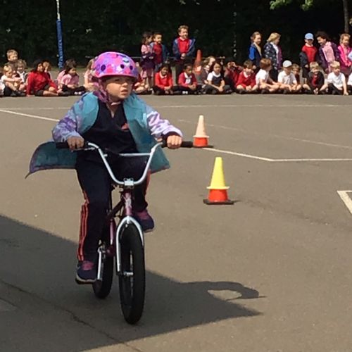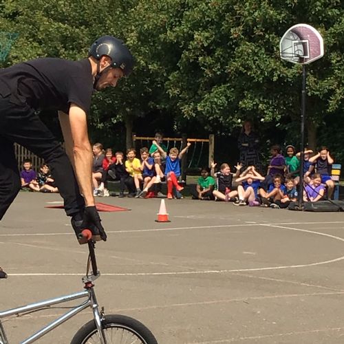 A very different approach to riding a bike for the Year 5s, after their on-road training ! Ex World Champion Mike Mullen, was clear to emphasise that the tricks were not for the road...